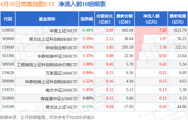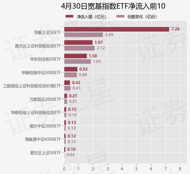 当日有20只宽基指数ETF基金出现资金净流入,其中净流入排首位的是华夏上证50ETF(510050),份额增加了2.69亿份,净流入额为7.26亿元。