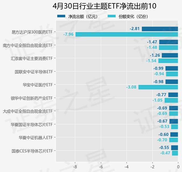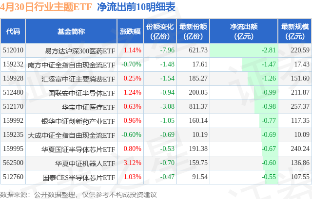 当日有217只行业主题ETF基金出现资金净流出,其中净流出排首位的是易方达沪深300医药ETF(512010),份额减少了7.96亿份,净流出额为2.81亿元。