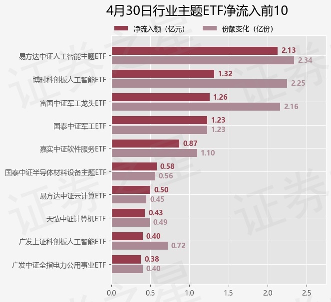 证券之星消息,4月30日行业主题ETF基金合计资金净流出10.06亿元,近5个交易日累计净流出16.98亿元,5个交易日中出现日合计资金净流出的有3天(ETF资金流向计算公式:(当日ETF场内流通份额-前一交易日ETF场内流通份额)*当日ETF均价,计算结果仅供参考)。