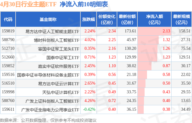 当日有74只行业主题ETF基金出现资金净流入,其中净流入排首位的是易方达中证人工智能主题ETF(159819),份额增加了2.34亿份,净流入额为2.13亿元。