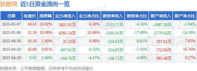 5月7日的资金流向数据方面,主力资金净流入3421.01万元,占总成交额6.1%,游资资金净流出2333.71万元,占总成交额4.16%,散户资金净流出1087.3万元,占总成交额1.94%。