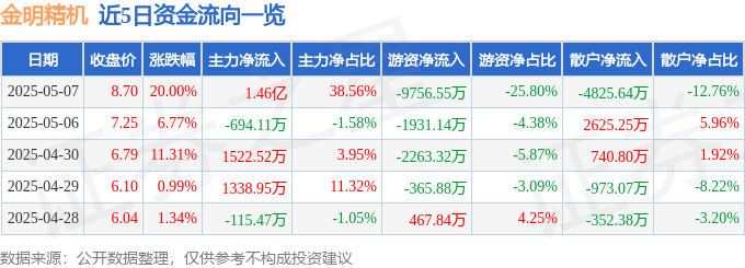5月7日的资金流向数据方面,主力资金净流入1.46亿元,占总成交额38.56%,游资资金净流出9756.55万元,占总成交额25.8%,散户资金净流出4825.64万元,占总成交额12.76%。
