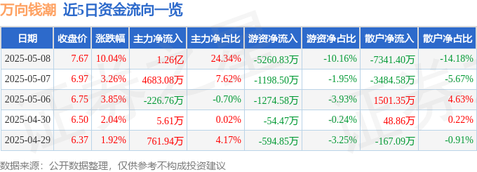5月8日的资金流向数据方面,主力资金净流入1.26亿元,占总成交额24.34%,游资资金净流出5260.83万元,占总成交额10.16%,散户资金净流出7341.4万元,占总成交额14.18%。