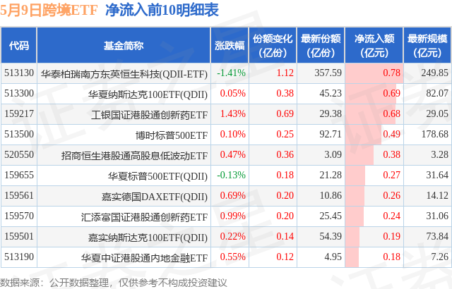 当日有39只跨境ETF基金出现资金净流入,其中净流入排首位的是华泰柏瑞南方东英恒生科技(QDII-ETF)(513130),份额增加了1.12亿份,净流入额为7838.22万元。