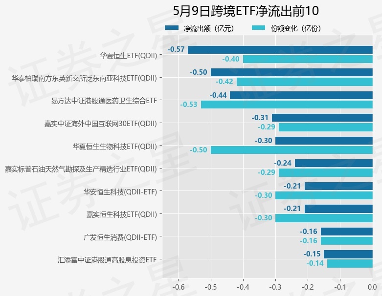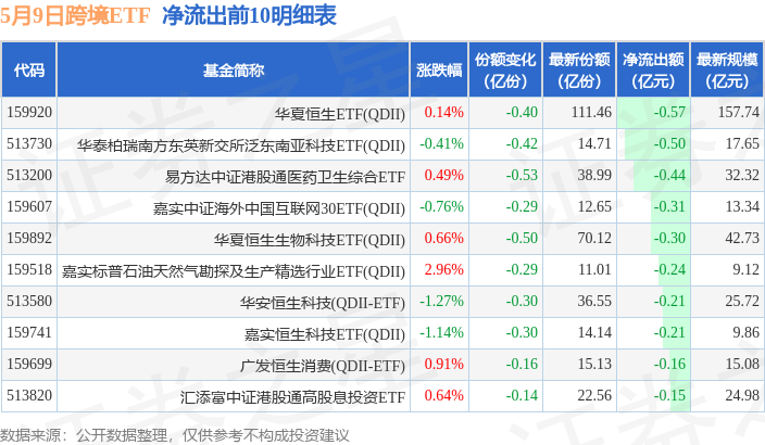 当日有40只跨境ETF基金出现资金净流出,其中净流出排首位的是华夏恒生ETF(QDII)(159920),份额减少了4000.0万份,净流出额为5653.32万元。