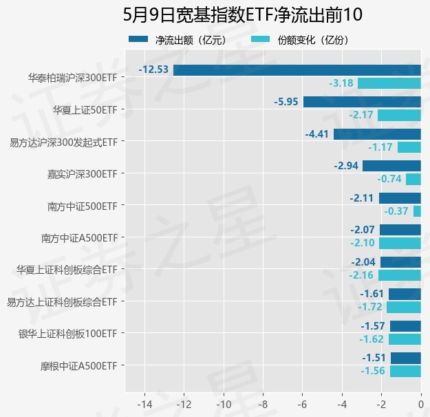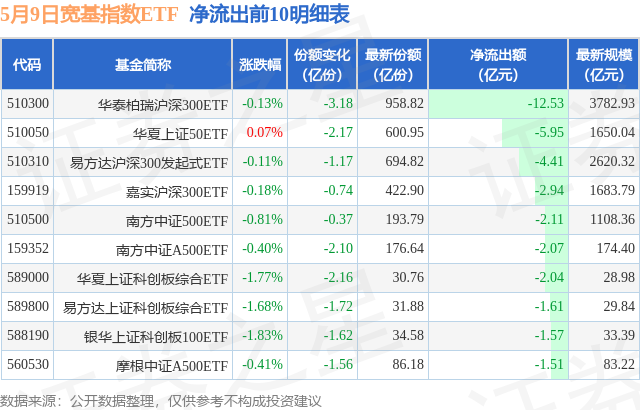 当日有123只宽基指数ETF基金出现资金净流出,其中净流出排首位的是华泰柏瑞沪深300ETF(510300),份额减少了3.18亿份,净流出额为12.53亿元。