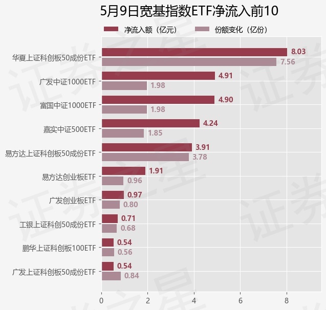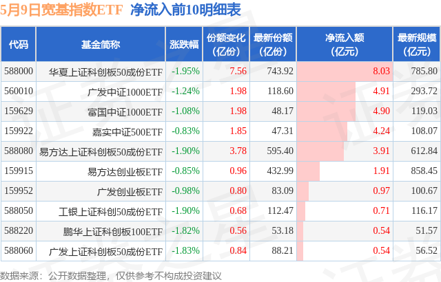 当日有34只宽基指数ETF基金出现资金净流入,其中净流入排首位的是华夏上证科创板50成份ETF(588000),份额增加了7.56亿份,净流入额为8.03亿元。