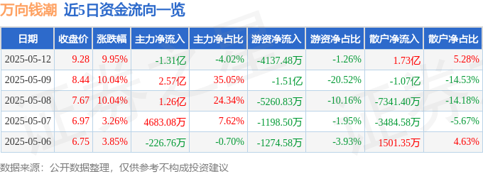 5月12日的资金流向数据方面,主力资金净流出1.31亿元,占总成交额4.02%,游资资金净流出4137.48万元,占总成交额1.26%,散户资金净流入1.73亿元,占总成交额5.28%。