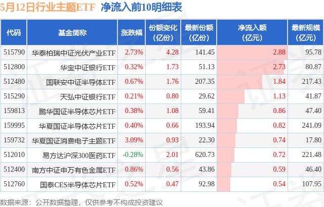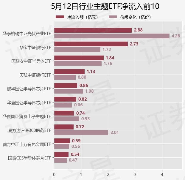 当日有107只行业主题ETF基金出现资金净流入,其中净流入排首位的是华泰柏瑞中证光伏产业ETF(515790),份额增加了4.28亿份,净流入额为2.88亿元。