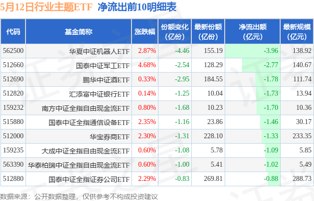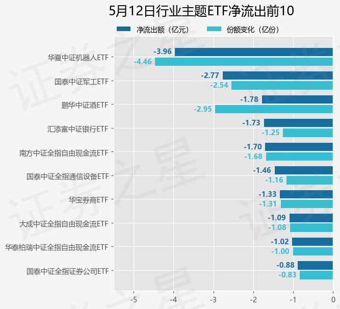 当日有170只行业主题ETF基金出现资金净流出,其中净流出排首位的是华夏中证机器人ETF(562500),份额减少了4.46亿份,净流出额为3.96亿元。
