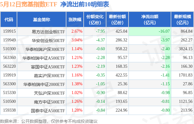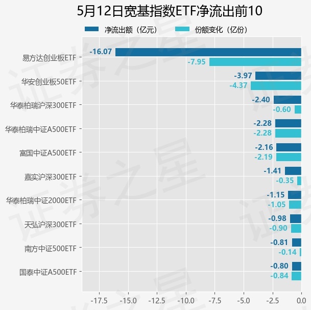 当日有95只宽基指数ETF基金出现资金净流出,其中净流出排首位的是易方达创业板ETF(159915),份额减少了7.95亿份,净流出额为16.07亿元。