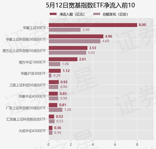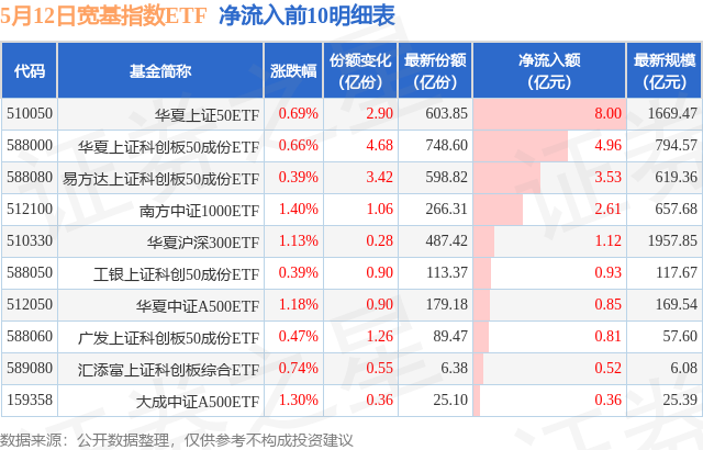 当日有45只宽基指数ETF基金出现资金净流入,其中净流入排首位的是华夏上证50ETF(510050),份额增加了2.9亿份,净流入额为8.0亿元。