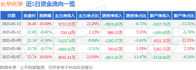 5月13日的资金流向数据方面,主力资金净流入9757.25万元,占总成交额22.26%,游资资金净流出3819.49万元,占总成交额8.72%,散户资金净流出5937.76万元,占总成交额13.55%。