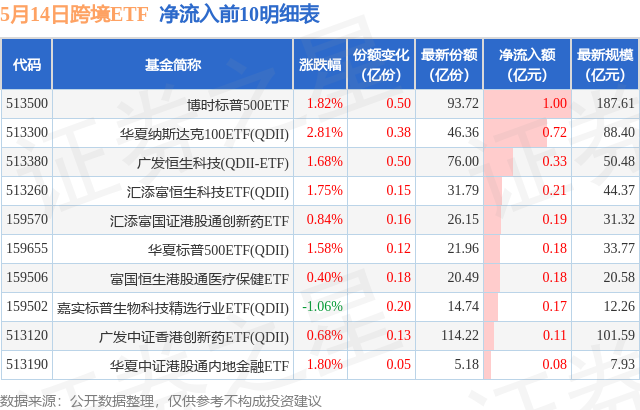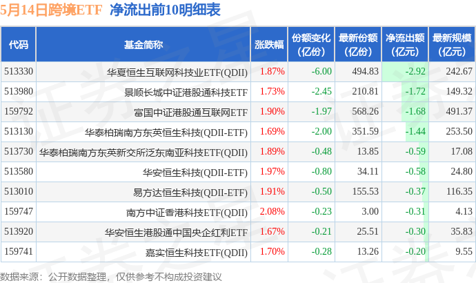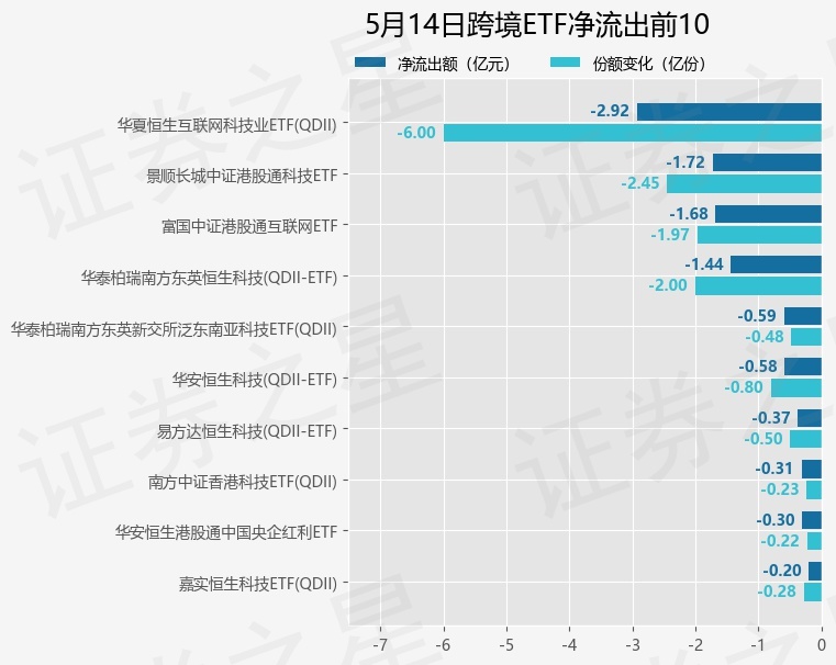 当日有27只跨境ETF基金出现资金净流出,其中净流出排首位的是华夏恒生互联网科技业ETF(QDII)(513330),份额减少了6.0亿份,净流出额为2.92亿元。