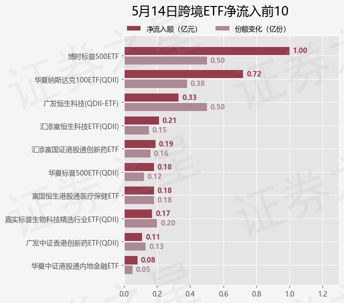 当日有27只跨境ETF基金出现资金净流入,其中净流入排首位的是博时标普500ETF(513500),份额增加了5000.0万份,净流入额为1.0亿元。