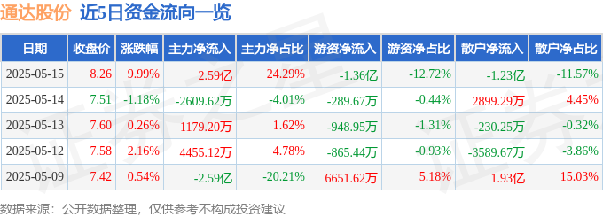 5月15日的资金流向数据方面,主力资金净流入2.59亿元,占总成交额24.29%,游资资金净流出1.36亿元,占总成交额12.72%,散户资金净流出1.23亿元,占总成交额11.57%。