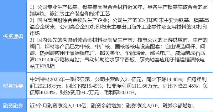 该股为3D打印,核电,有色金属概念热股,当日3D打印概念上涨1.47%,核电概念上涨1.36%,有色金属概念上涨0.95%。