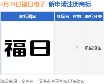 今年以来福建福日电子股份有限公司新申请注册商标1件,截止目前公司共持有注册商标318件,另有31件商标尚在注册申请中。