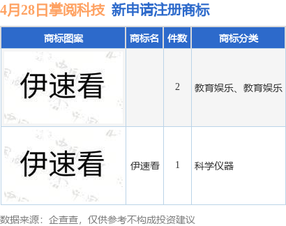 今年以来掌阅科技股份有限公司新申请注册商标29件,截止目前公司共持有注册商标2437件,另有244件商标尚在注册申请中。