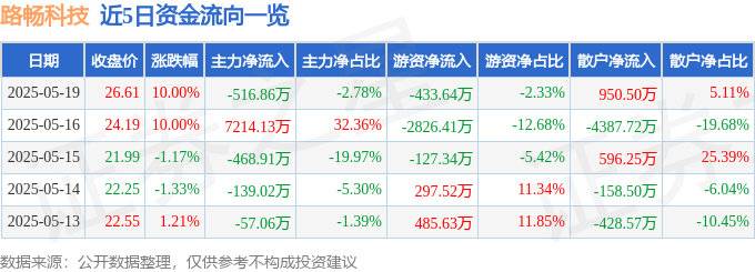 5月19日的资金流向数据方面,主力资金净流出516.86万元,占总成交额2.78%,游资资金净流出433.64万元,占总成交额2.33%,散户资金净流入950.5万元,占总成交额5.11%。