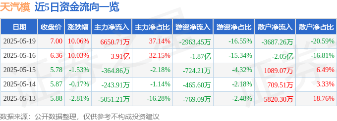 5月19日的资金流向数据方面,主力资金净流入6650.71万元,占总成交额37.14%,游资资金净流出2963.45万元,占总成交额16.55%,散户资金净流出3687.26万元,占总成交额20.59%。