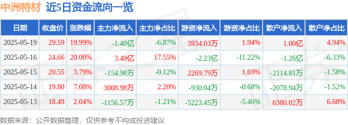 5月19日的资金流向数据方面,主力资金净流出1.4亿元,占总成交额6.87%,游资资金净流入3934.03万元,占总成交额1.94%,散户资金净流入1.0亿元,占总成交额4.94%。