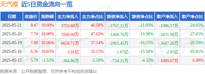5月21日的资金流向数据方面,主力资金净流入3753.68万元,占总成交额46.58%,游资资金净流出1767.31万元,占总成交额21.93%,散户资金净流出1986.37万元,占总成交额24.65%。