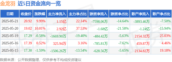 5月21日的资金流向数据方面,主力资金净流入1.15亿元,占总成交额22.14%,游资资金净流出7598.06万元,占总成交额14.64%,散户资金净流出3893.46万元,占总成交额7.5%。