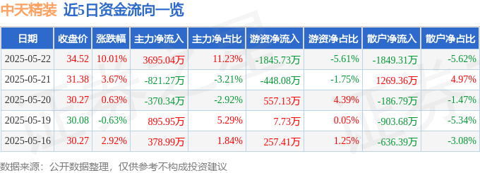 5月22日的资金流向数据方面,主力资金净流入3695.04万元,占总成交额11.23%,游资资金净流出1845.73万元,占总成交额5.61%,散户资金净流出1849.31万元,占总成交额5.62%。