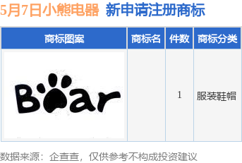 今年以来小熊电器股份有限公司新申请注册商标12件,截止目前公司共持有注册商标2480件,另有515件商标尚在注册申请中。