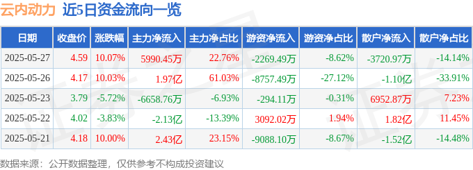 5月27日的资金流向数据方面,主力资金净流入5990.45万元,占总成交额22.76%,游资资金净流出2269.49万元,占总成交额8.62%,散户资金净流出3720.97万元,占总成交额14.14%。