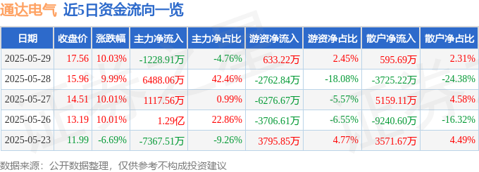 5月29日的资金流向数据方面,主力资金净流出1228.91万元,占总成交额4.76%,游资资金净流入633.22万元,占总成交额2.45%,散户资金净流入595.69万元,占总成交额2.31%。