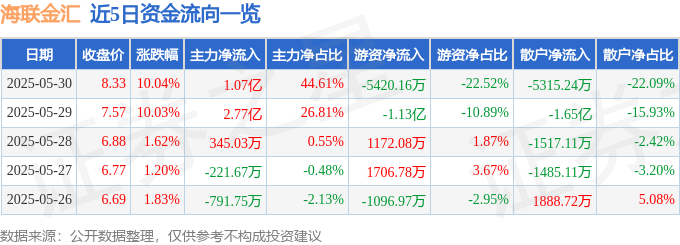 5月30日的资金流向数据方面,主力资金净流入1.07亿元,占总成交额44.61%,游资资金净流出5420.16万元,占总成交额22.52%,散户资金净流出5315.24万元,占总成交额22.09%。