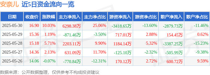 5月30日的资金流向数据方面,主力资金净流入6298.38万元,占总成交额25.06%,游资资金净流出3418.65万元,占总成交额13.6%,散户资金净流出2879.73万元,占总成交额11.46%。