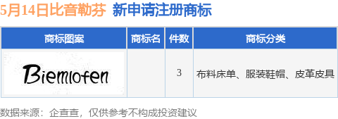 今年以来比音勒芬服饰股份有限公司新申请注册商标19件,截止目前公司共持有注册商标1109件,另有159件商标尚在注册申请中。