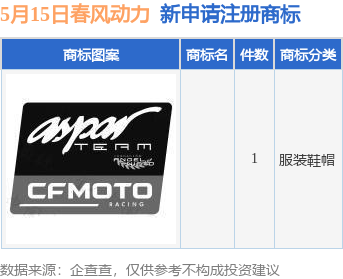 今年以来浙江春风动力股份有限公司新申请注册商标4件,截止目前公司共持有注册商标448件,另有30件商标尚在注册申请中。