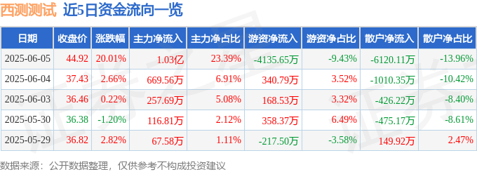 6月5日的资金流向数据方面,主力资金净流入1.03亿元,占总成交额23.39%,游资资金净流出4135.65万元,占总成交额9.43%,散户资金净流出6120.11万元,占总成交额13.96%。