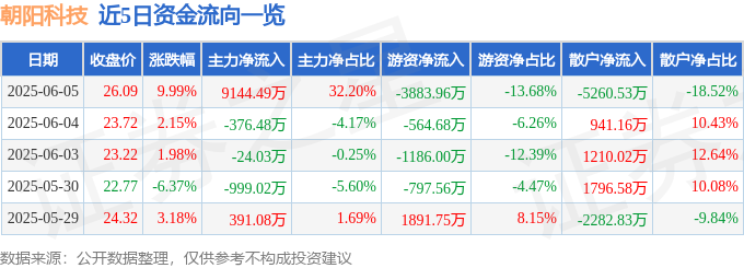 6月5日的资金流向数据方面,主力资金净流入9144.49万元,占总成交额32.2%,游资资金净流出3883.96万元,占总成交额13.68%,散户资金净流出5260.53万元,占总成交额18.52%。