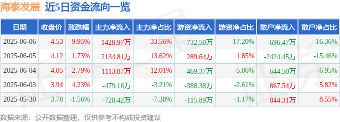6月6日的资金流向数据方面,主力资金净流入1428.97万元,占总成交额33.56%,游资资金净流出732.5万元,占总成交额17.2%,散户资金净流出696.47万元,占总成交额16.36%。