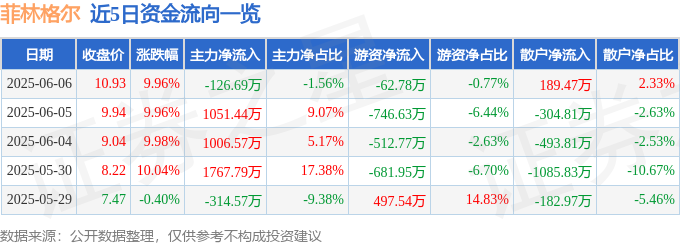 6月6日的资金流向数据方面,主力资金净流出126.69万元,占总成交额1.56%,游资资金净流出62.78万元,占总成交额0.77%,散户资金净流入189.47万元,占总成交额2.33%。
