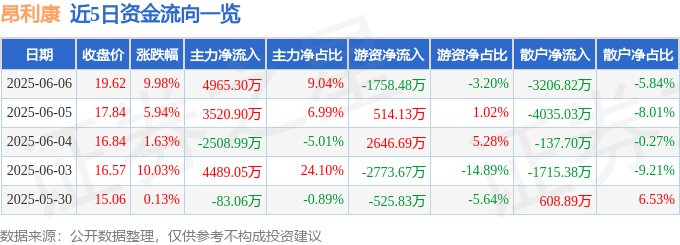 6月6日的资金流向数据方面,主力资金净流入4965.3万元,占总成交额9.04%,游资资金净流出1758.48万元,占总成交额3.2%,散户资金净流出3206.82万元,占总成交额5.84%。