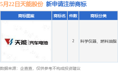 今年以来天能电池集团股份有限公司新申请注册商标9件,截止目前公司共持有注册商标1096件,另有155件商标尚在注册申请中。
