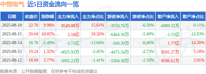 8月18日的资金流向数据方面,主力资金净流入8549.08万元,占总成交额15.61%,游资资金净流出3559.76万元,占总成交额6.5%,散户资金净流出4989.32万元,占总成交额9.11%。