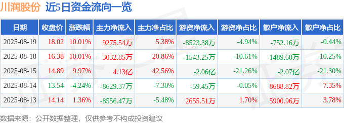 8月19日的资金流向数据方面,主力资金净流入9275.54万元,占总成交额5.38%,游资资金净流出8523.38万元,占总成交额4.94%,散户资金净流出752.16万元,占总成交额0.44%。