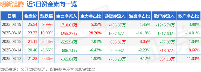 8月19日的资金流向数据方面,主力资金净流入1710.61万元,占总成交额5.35%,游资资金净流出463.87万元,占总成交额1.45%,散户资金净流出1246.74万元,占总成交额3.9%。