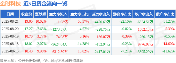 8月21日的资金流向数据方面,主力资金净流入1.08亿元,占总成交额53.37%,游资资金净流出4470.69万元,占总成交额22.1%,散户资金净流出6324.51万元,占总成交额31.27%。