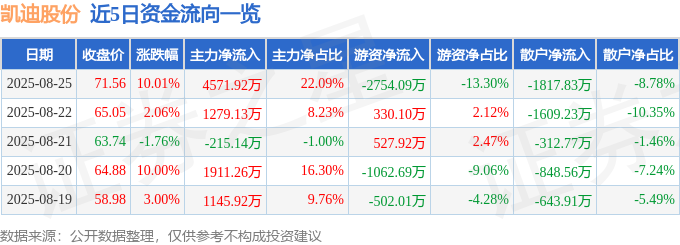 8月25日的资金流向数据方面,主力资金净流入4571.92万元,占总成交额22.09%,游资资金净流出2754.09万元,占总成交额13.3%,散户资金净流出1817.83万元,占总成交额8.78%。