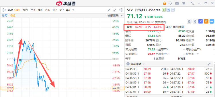 热烈狂欢后,本周一白银突发跳水,现货白银早间突破84美元再创历史新高,随即开始剧烈回调,截至发稿,白银ETF $SLV 盘前回调4%,黄金跌近2%。