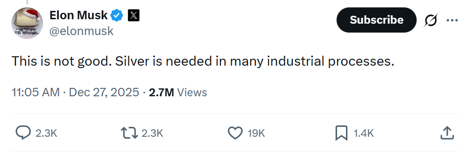 马斯克评论白银大涨:白银在许多工业过程中是被需要的