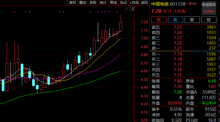 早间,电信运营股放量走强,板块指数高开高走一度涨逾2%,仅约1个小时成交就超过昨日全天成交。板块内所有个股飘红,中国电信最高摸至7.3元,距历史最高点7.32元仅差2分钱;中国移动股价距历史最高点也仅差1.78%;中国联通则创阶段性新高。